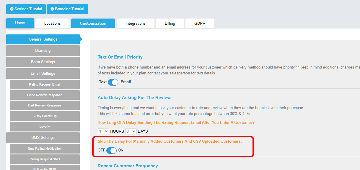2. SMS Notification for Completed Reviews in the User Back office -> settings -> customization -> SMS settings