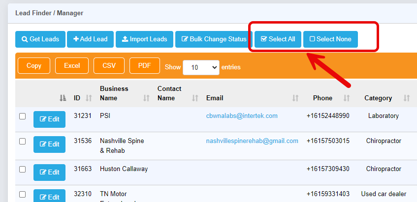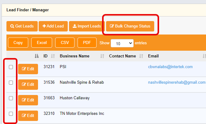7. You can now use a "select all" button on the lead finder to bulk clear/change status of leads at one time.