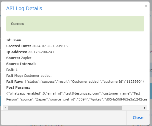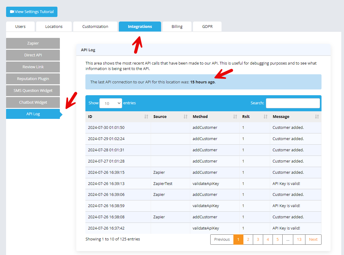 3. Businesses can now see details of any integration points they have configured through Zapier in their back office. If a sync is active with Zapier to integrate/pull information, the back office will show sync data that helps troubleshoot if there is an issue with a Zapier integration.
