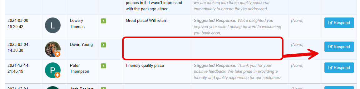 3. For reviews where no comment has been made, but a review was left on Google, a business can now respond to a review with no comments through our system on their reviews page. The business just clicks "respond" and the response will be sent to Google: