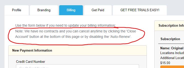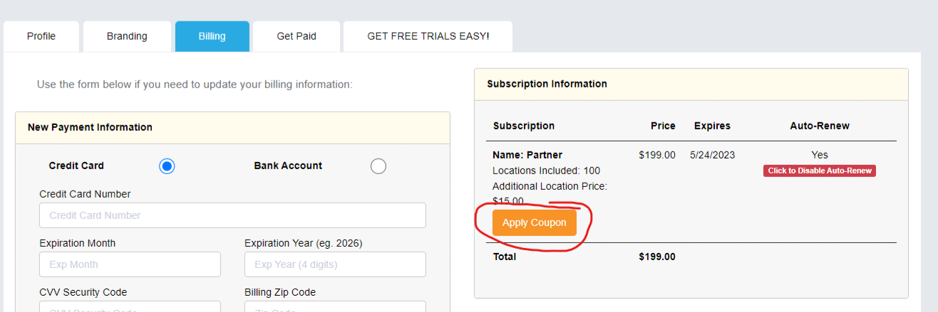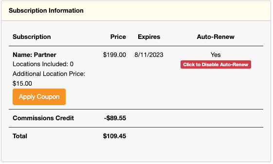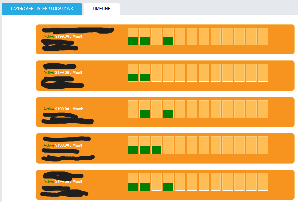 6. The new internalized invoicing system (Only available now for paying affiliate commissions via direct deposit and not for charging businesses/users internally) now takes out partner monthly affiliate payments and applies them to the 199 + 15 per month fee.